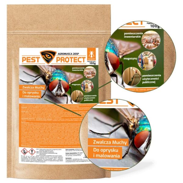 Skuteczny preparat w postaci koncentratu w proszku Agromusca 20SP PEST PROTECT to silny środek do zwalczania much w pomieszczeniach inwentarskich, użyteczności publicznej, magazynach, domu. Zwalcza muchy i inne owady latające (z wyłączeniem os i szerszeni).